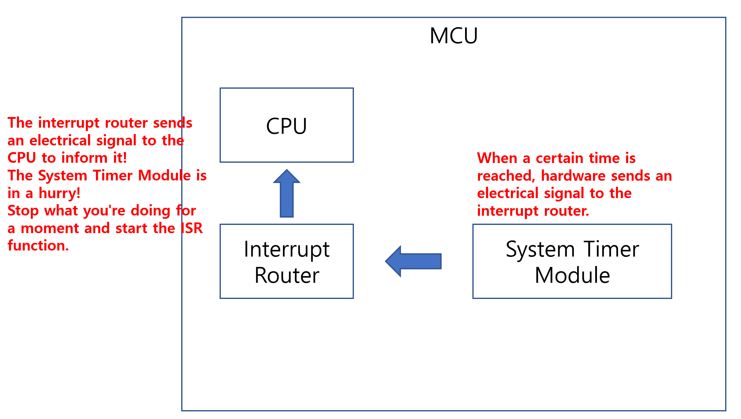 The meaning of the electric signal is "Stop what you are doing for a while and run the System Timer Module ISR (Interrupt Service Routine)!"