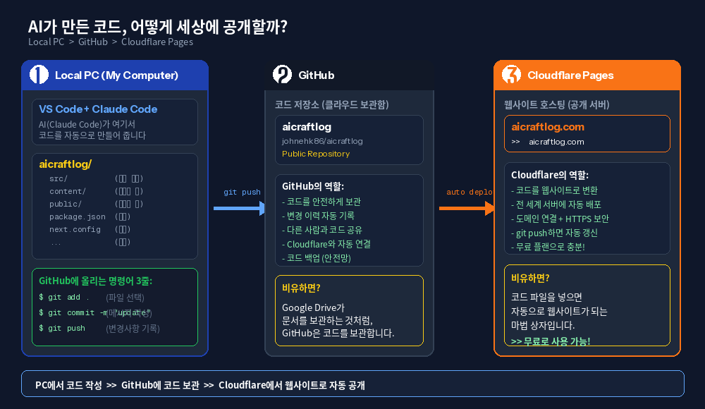 GitHub에 올린 코드 파일들은 그 자체로는 웹사이트가 아닙니다. 누군가 aicraftlog.com을 입력했을 때 화면이 나오려면, 코드를 웹사이트로 변환하고 전 세계에서 접속 가능한 서버에 올려야 합니다.