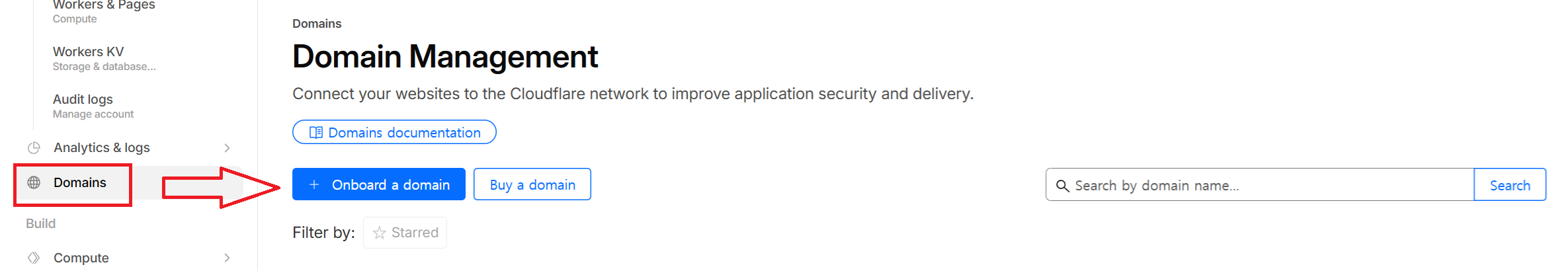 Cloudflare 대시보드에서 Domains 메뉴로 들어가서 **"Buy a domain"**을 선택합니다.