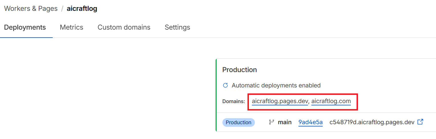 - aicraftlog.pages.dev — Cloudflare가 무료로 제공하는 기본 도메인