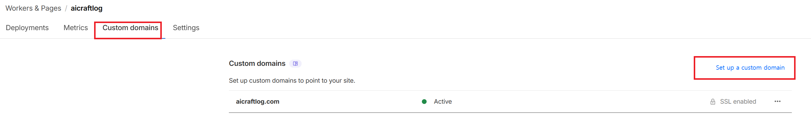 Cloudflare 대시보드에서 Workers & Pages → 프로젝트(aicraftlog) 선택 → Custom domains 탭으로 이동합니다.
