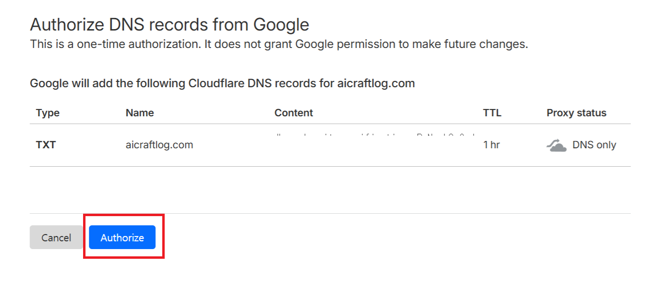 구글이 제공하는 TXT 레코드 값을 복사한 뒤, Cloudflare 대시보드에서 DNS 설정에 추가합니다.