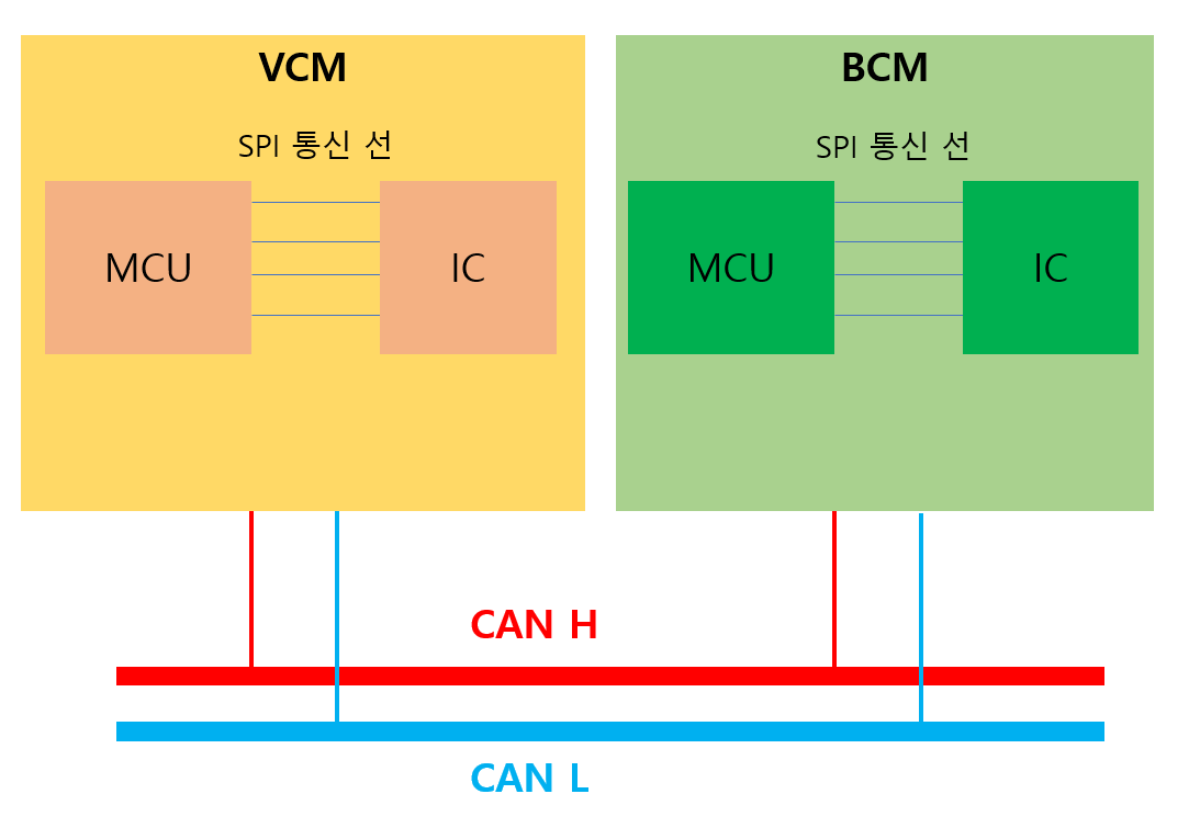 이 두개의 ECU는 아래와 같이 CAN 라인을 통해서 정보를 주고 받습니다.