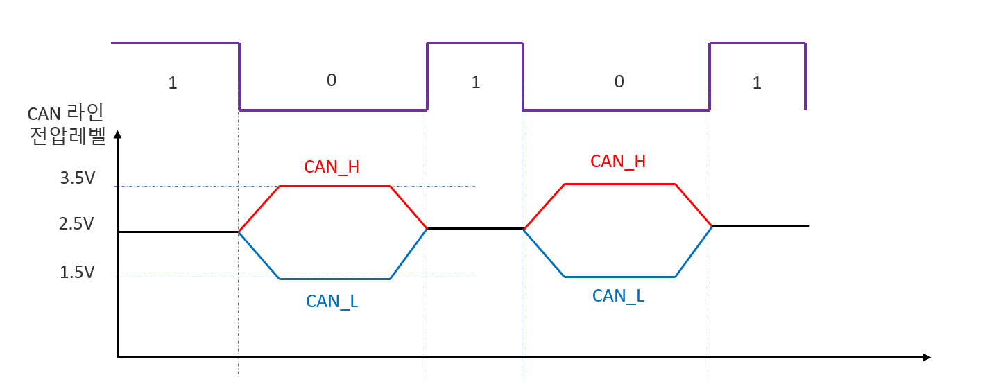 만일 0을 전달하고 싶으면 CAN_H는 3.5V 그리고 CAH_L라인은 1.5V를 냅니다.