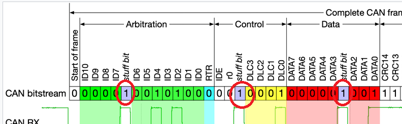 - 총 11개의 비트로 표현구성이 되어 있습니다. 위에서는 stuff bit가 추가되어 있는데 이것은 나중에 이야기할게요!