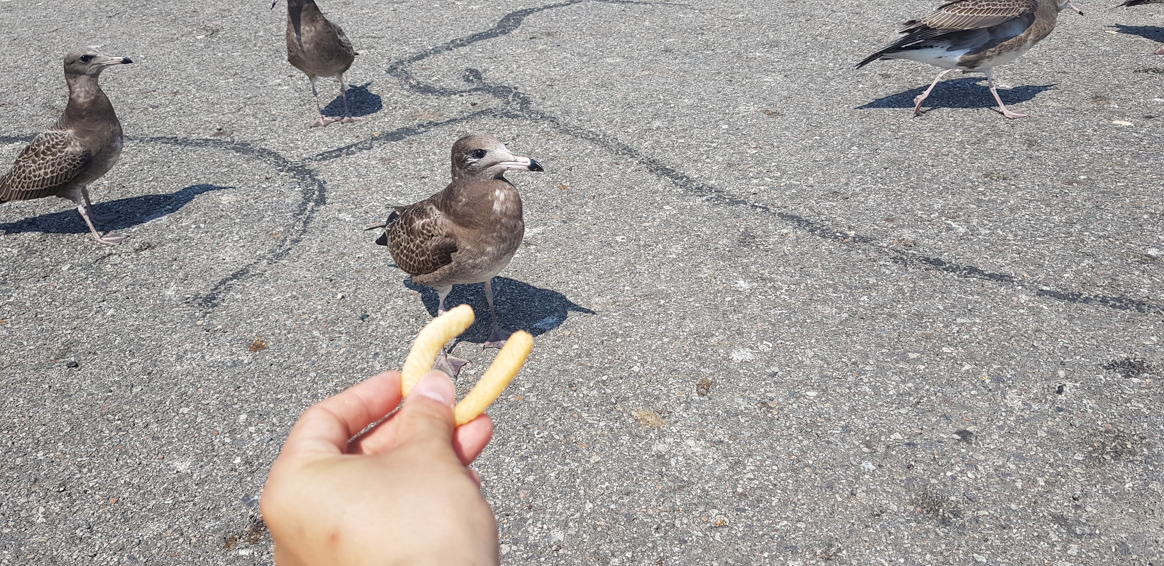 그래서 갈매기에게 먹이를 주려고 발걸음을 옮겼습니다.
