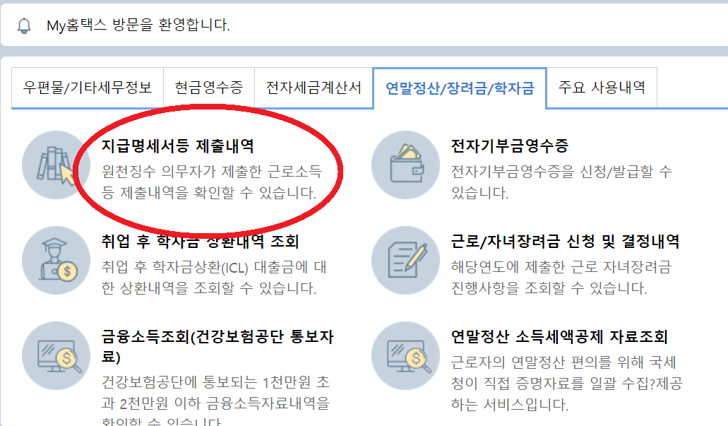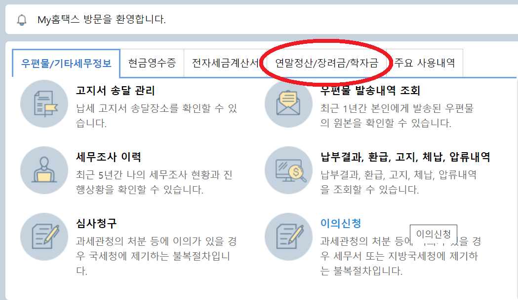 3. My 홈택스에서 '연말정산/장려금/학자금' 탭을 클릭합니다.